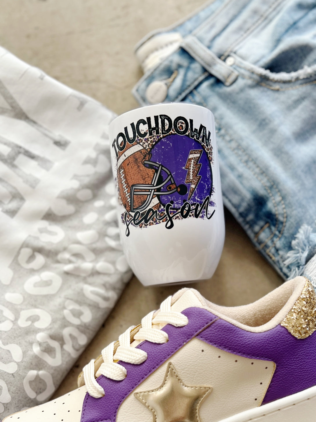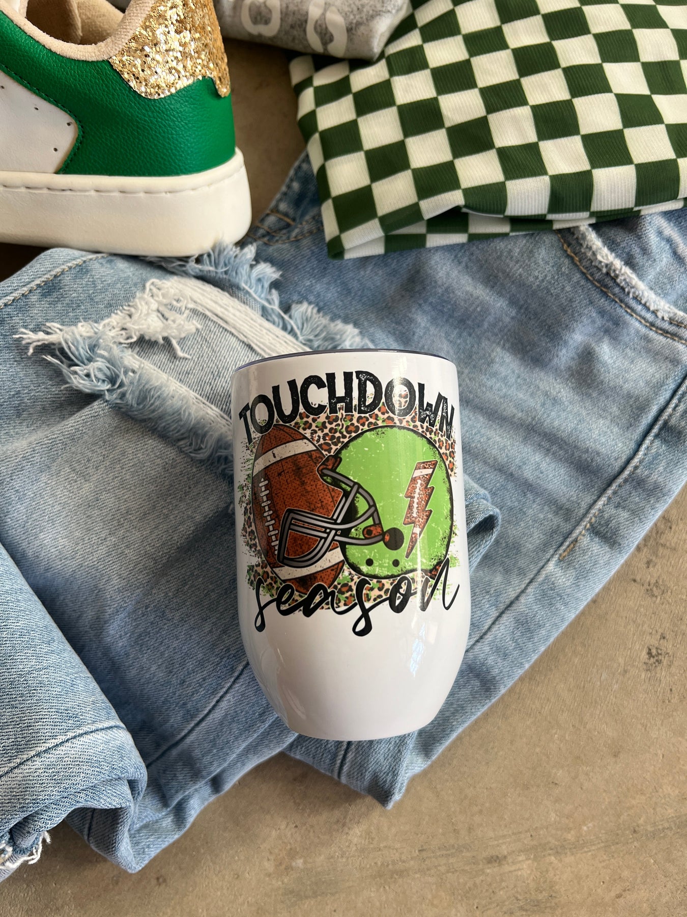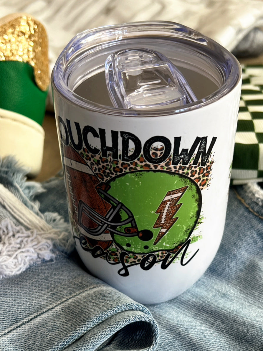 Stay hydrated and show off your team spirit with our Game Day Helmet Touchdown Season 12oz. Cup! Perfect for on-the-go, this tumbler cup features a double wall vacuum insulation to keep your drink at the perfect temperature. With a convenient lid and a design on both sides, it's a must-have for any football mom or fan. Get yours now and be the envy of game day!