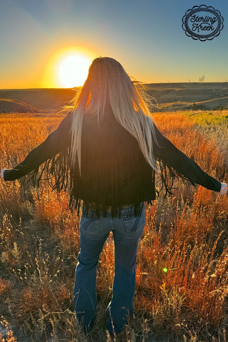 Radiate confidence and style in this one-of-a-kind black velvet jacket! Embellished with long fringe and dazzling rhinestones, it'll make you shine like a star every time you step out. You won't have to worry about being caught in a style slump - this jacket is sure to keep you looking stun-ning!