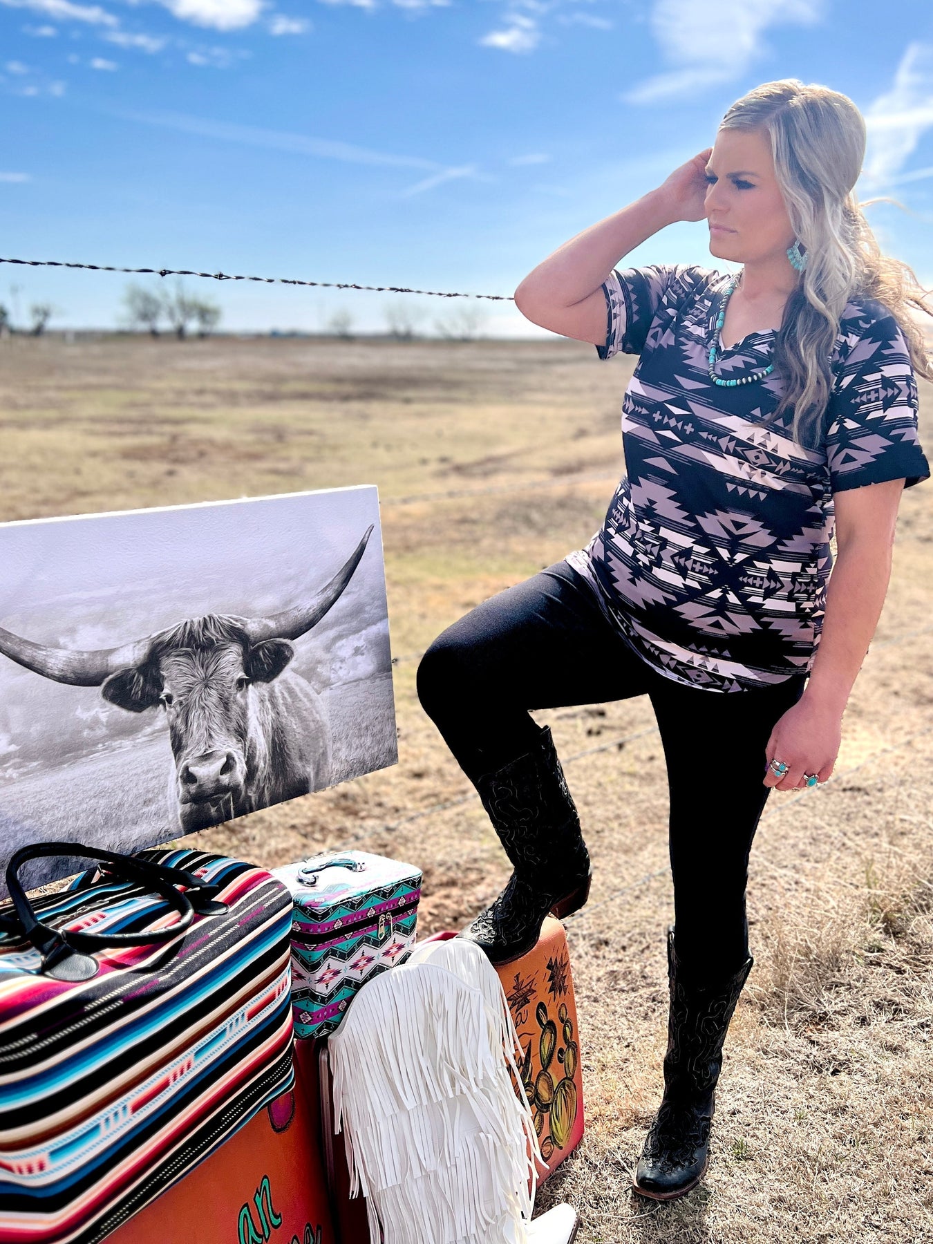 "Get ready to spice up your wardrobe with our PLUS Down In Denver Top! Featuring a trendy v-neck and eye-catching Aztec pattern in warm shades of black, brown and tan, this top is perfect for any occasion. Embrace your inner fashionista and stand out from the crowd! (Or stand out from the crowd and embrace your inner fashionista, we don't judge!)"