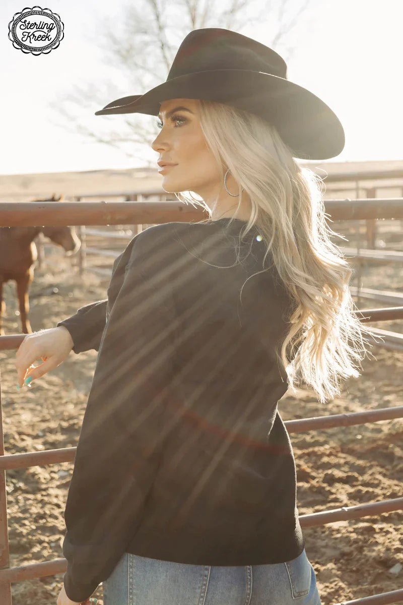 Get ready to wrangle in style with the PLUS HIGH CALL PULLOVER. This black pullover features a bold turquoise steer wrestler design, making it perfect for any cowgirl or cowboy. Stay warm and show off your love for the rodeo with this playful and unique addition to your wardrobe. Giddy up!