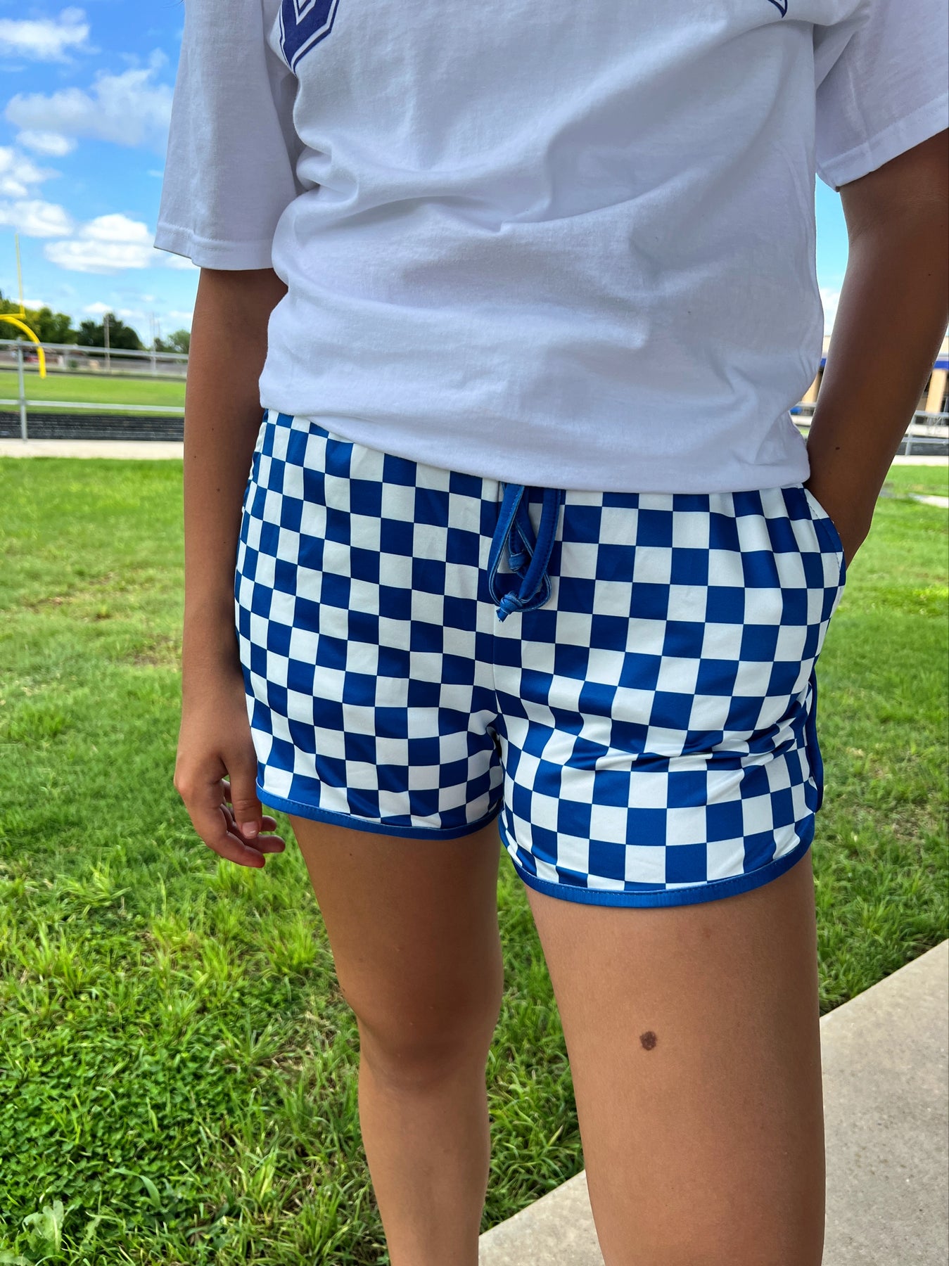 Get ready to cheer on your team in style with our Pep Rally Shorts in blue. These eye-catching and playful shorts feature a bold blue and white checkered pattern, perfect for showing off your team spirit. Made with high-quality fabric, they are comfortable for all-day wear. Go team!
