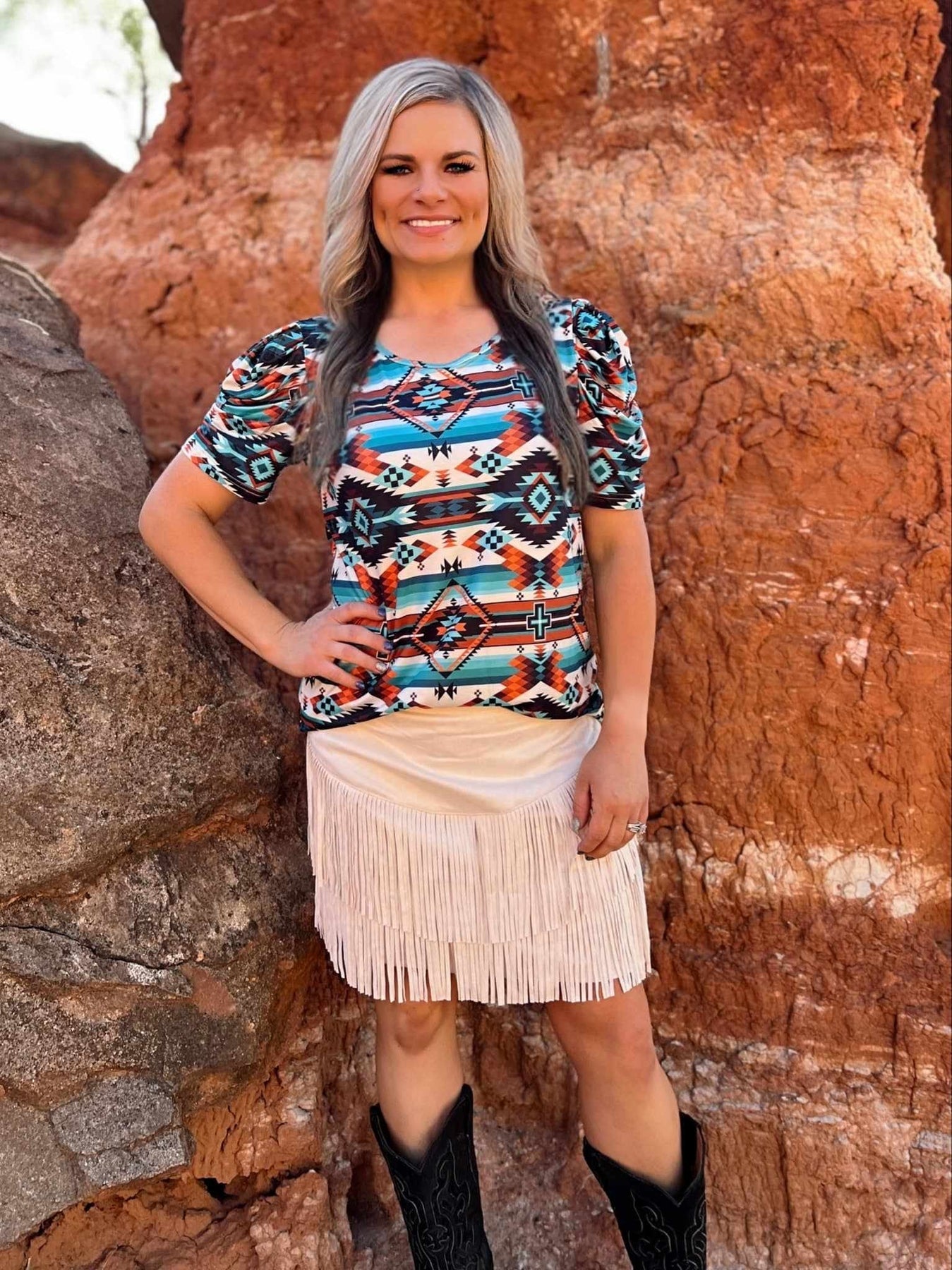 Take a trip down Memory Lane with this playful Aztec top! Featuring pops of turquoise and orange, you'll be sure to stand out in style. Express your fun and quirky side with this top, perfect for any casual occasion.