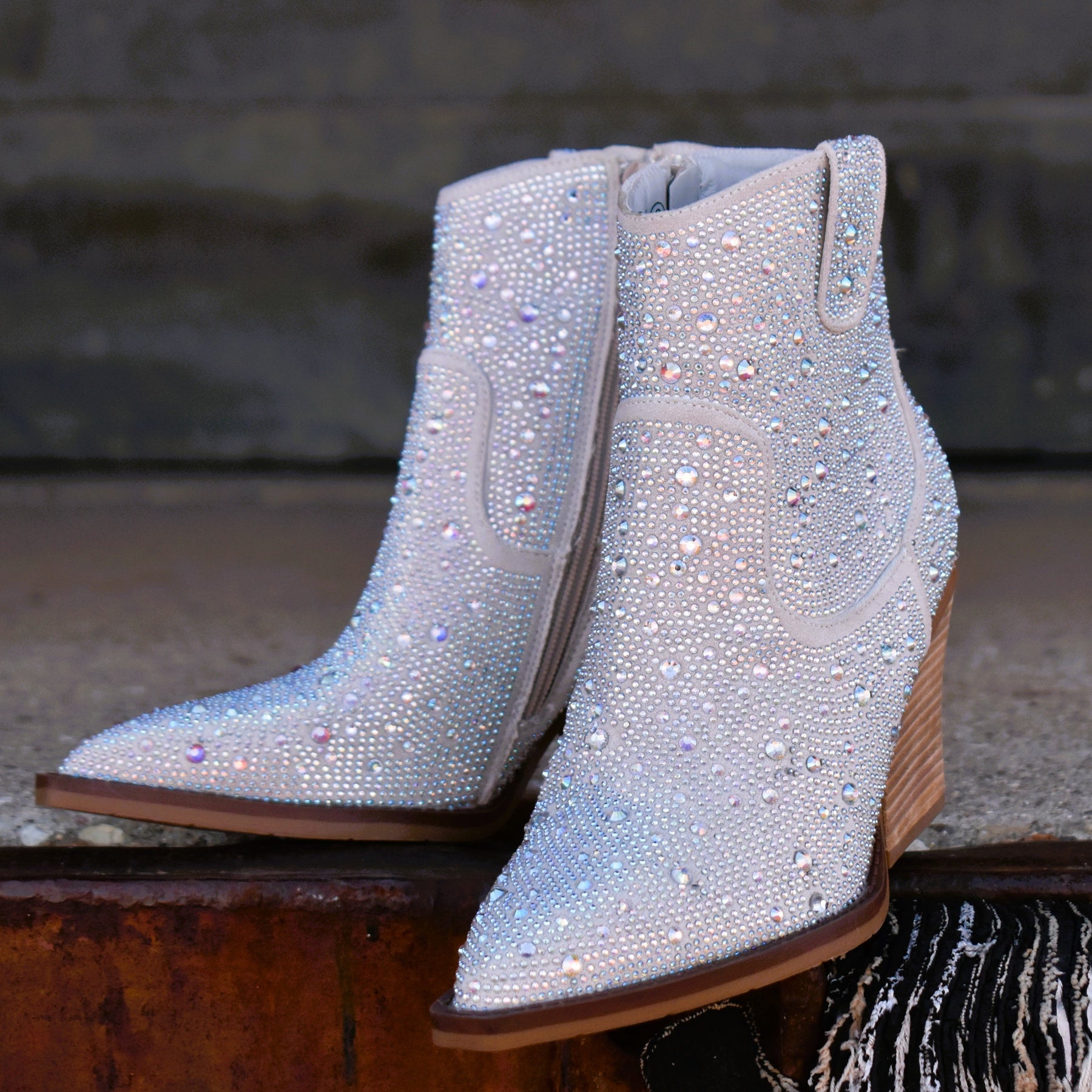 Add Glamour to any party with these "Kady" Silver Rhinestone Booties with allover rhinestone detailing. Pointed Toe Silhouette,  side zipper closure, 3" wooden block heel, 5" ankle length from ankle to top of bootie. 8 1/2" total inches tall from sole to top of Bootie.