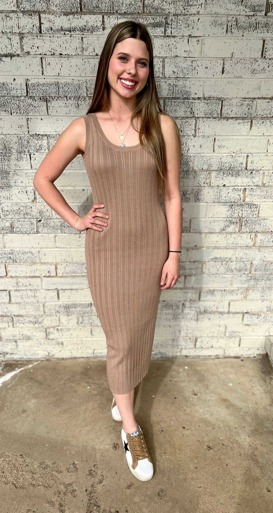 Indulge in luxury with our She's A Brick House Dress. This body-con knit dress is the definition of chic, with its ribbed design and form-fitting silhouette. The stretchy fabric hugs your curves for a sexy and trendy look that will turn heads. Elevate your fashion game with this must-have dress.