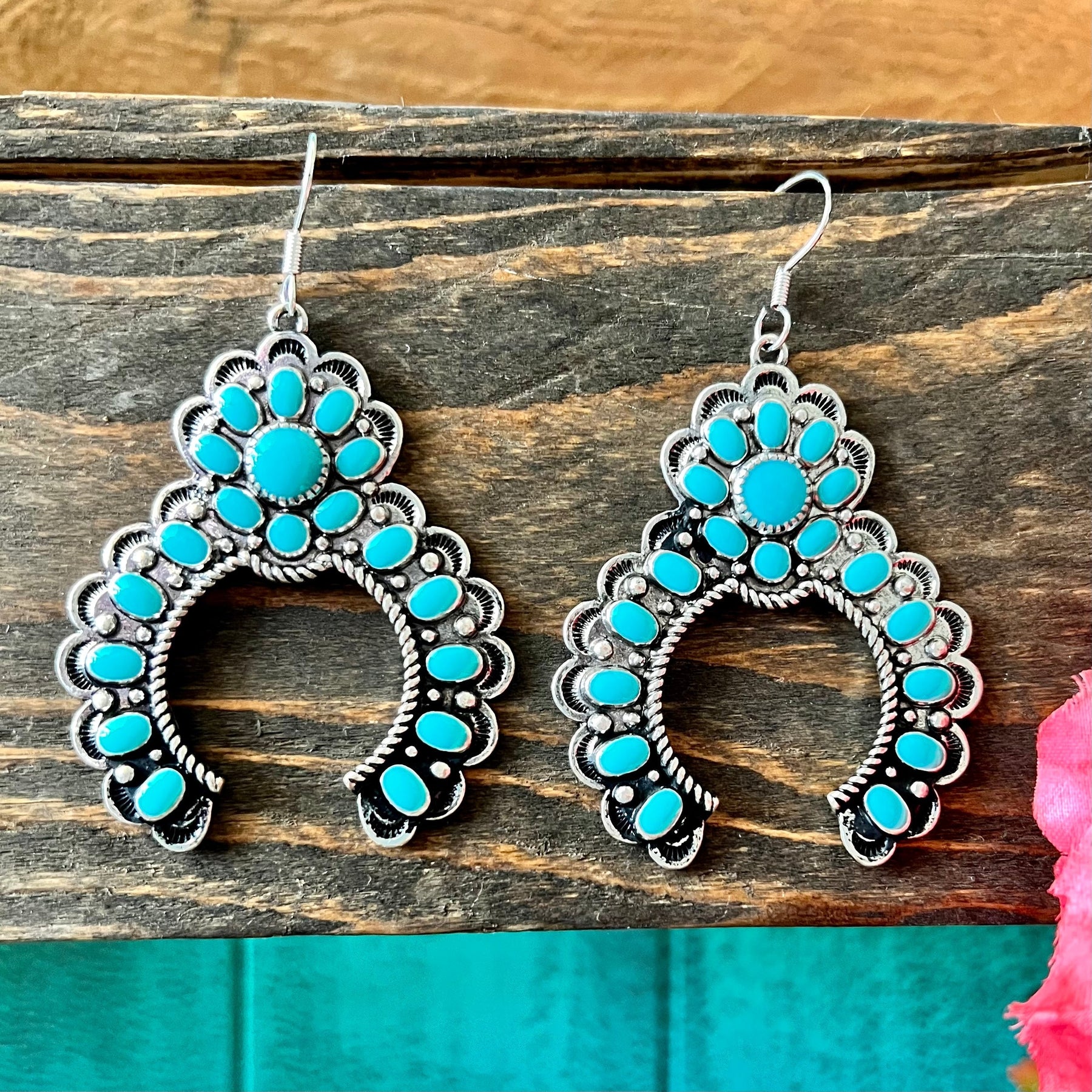 These In Full Bloom Blossom Earrings are crafted from high polish silver in a western concho style. The textured squash blossom design features genuine turquoise stones and a fish hook dangle for a unique, eye-catching look. Perfect for any occasion.