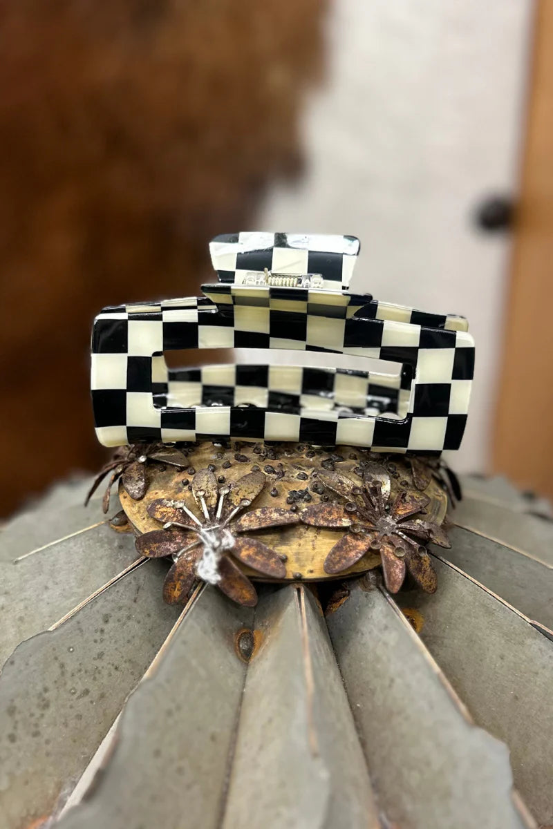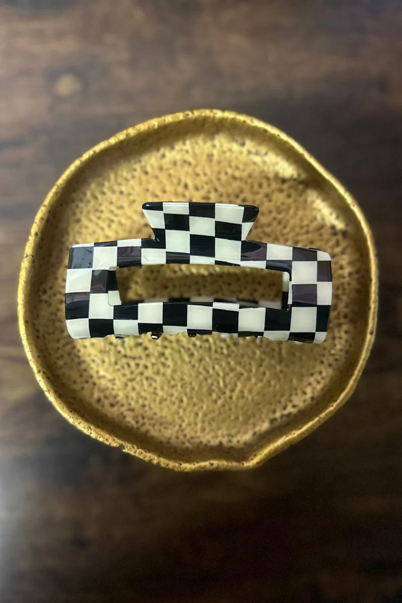 Snag this groovy black and white checkered claw clip and let your hair do the talking! Perfect for keeping your locks in place while adding a pop of retro-cool style to any look. Whether you're throwing your hair up for a casual day or securing a sleek updo, this fun patterned clip delivers both hold and personality. A playful accessory that transforms your everyday hair routine into a fashion statement.
