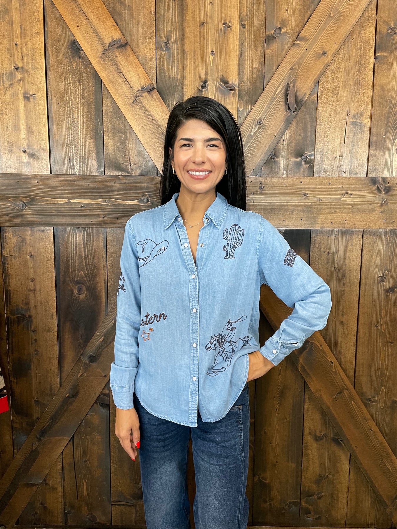 Western Denim Embroidered Snap Button Top I Gussied Up Online Boutique