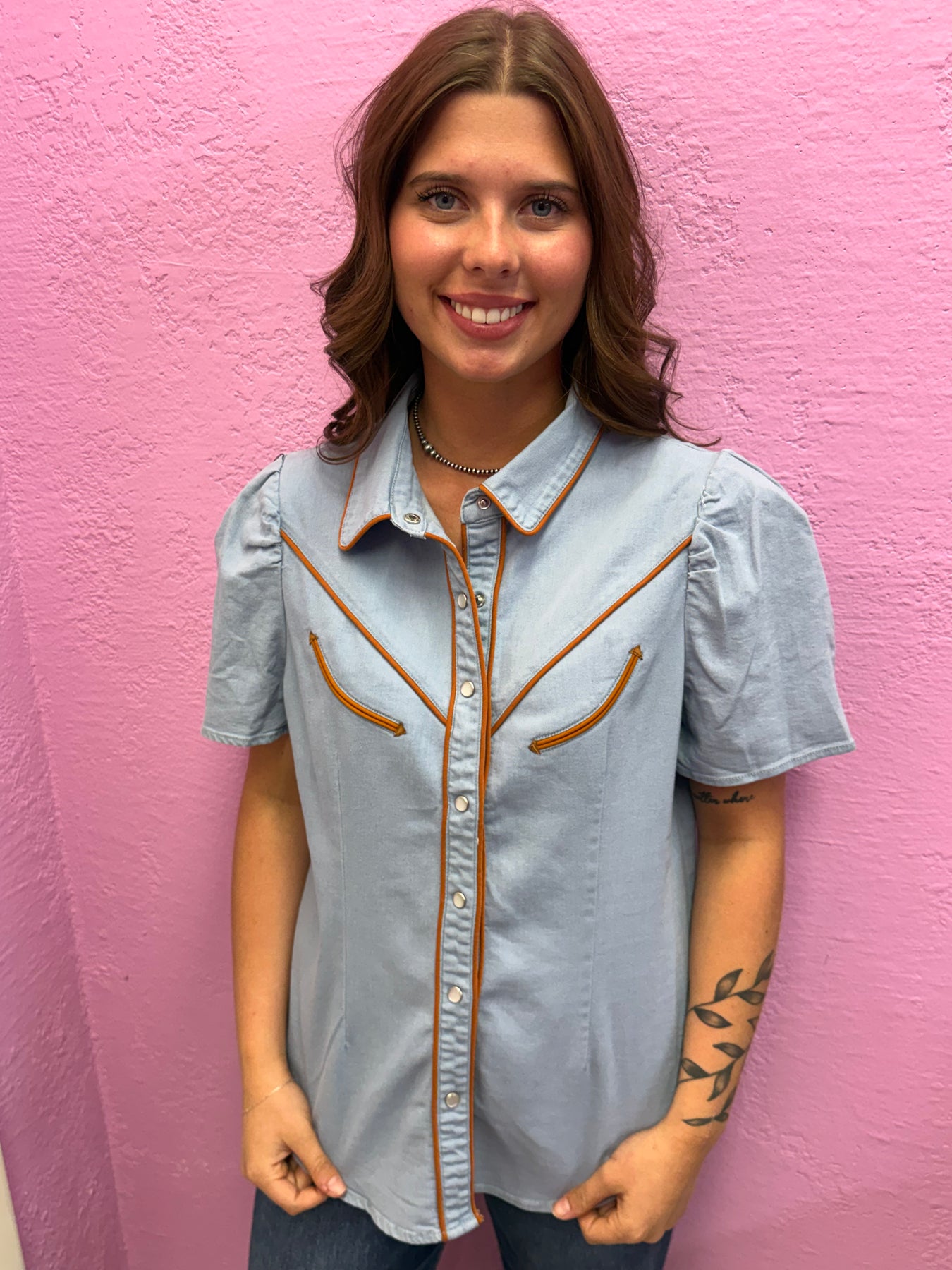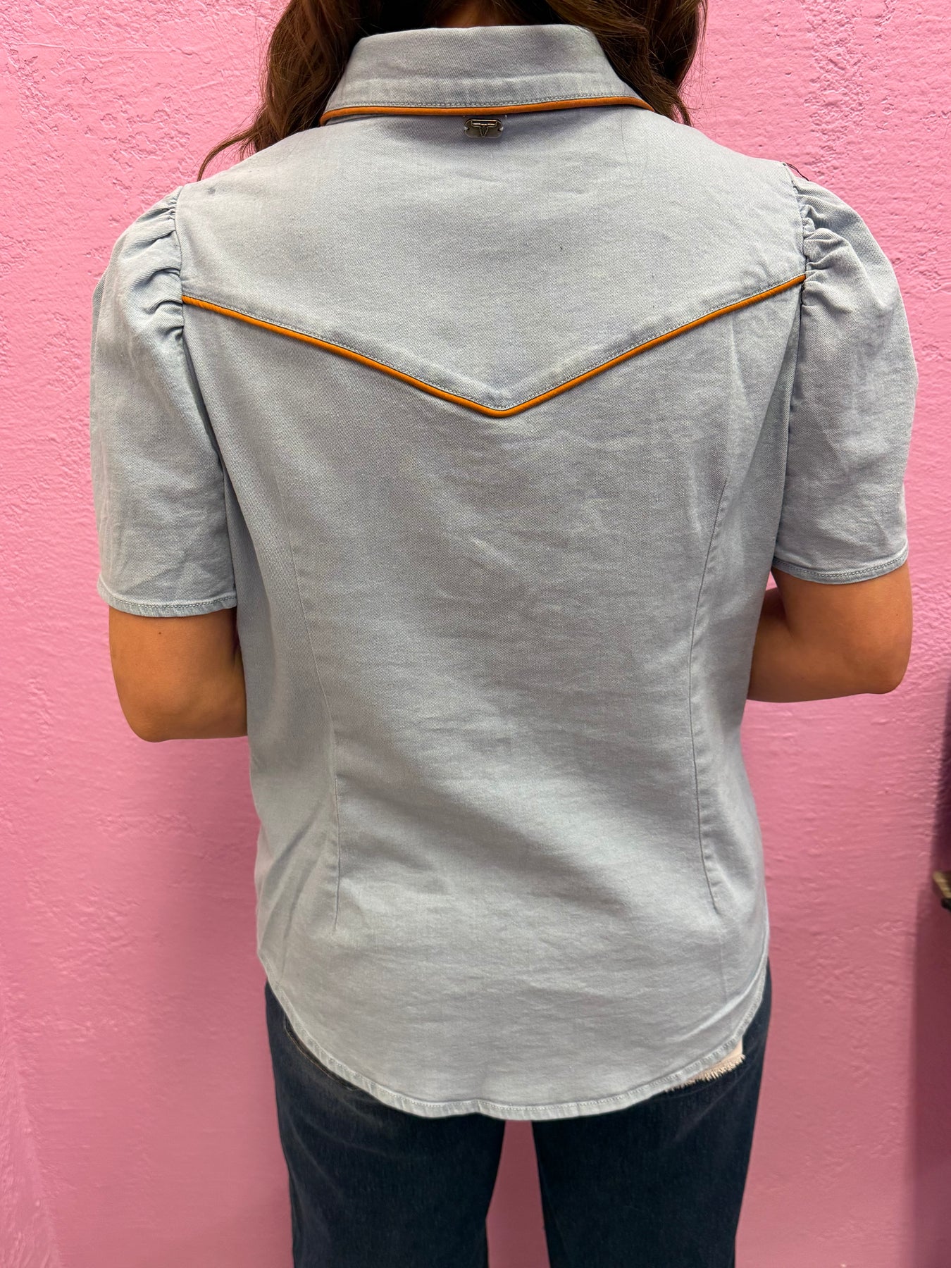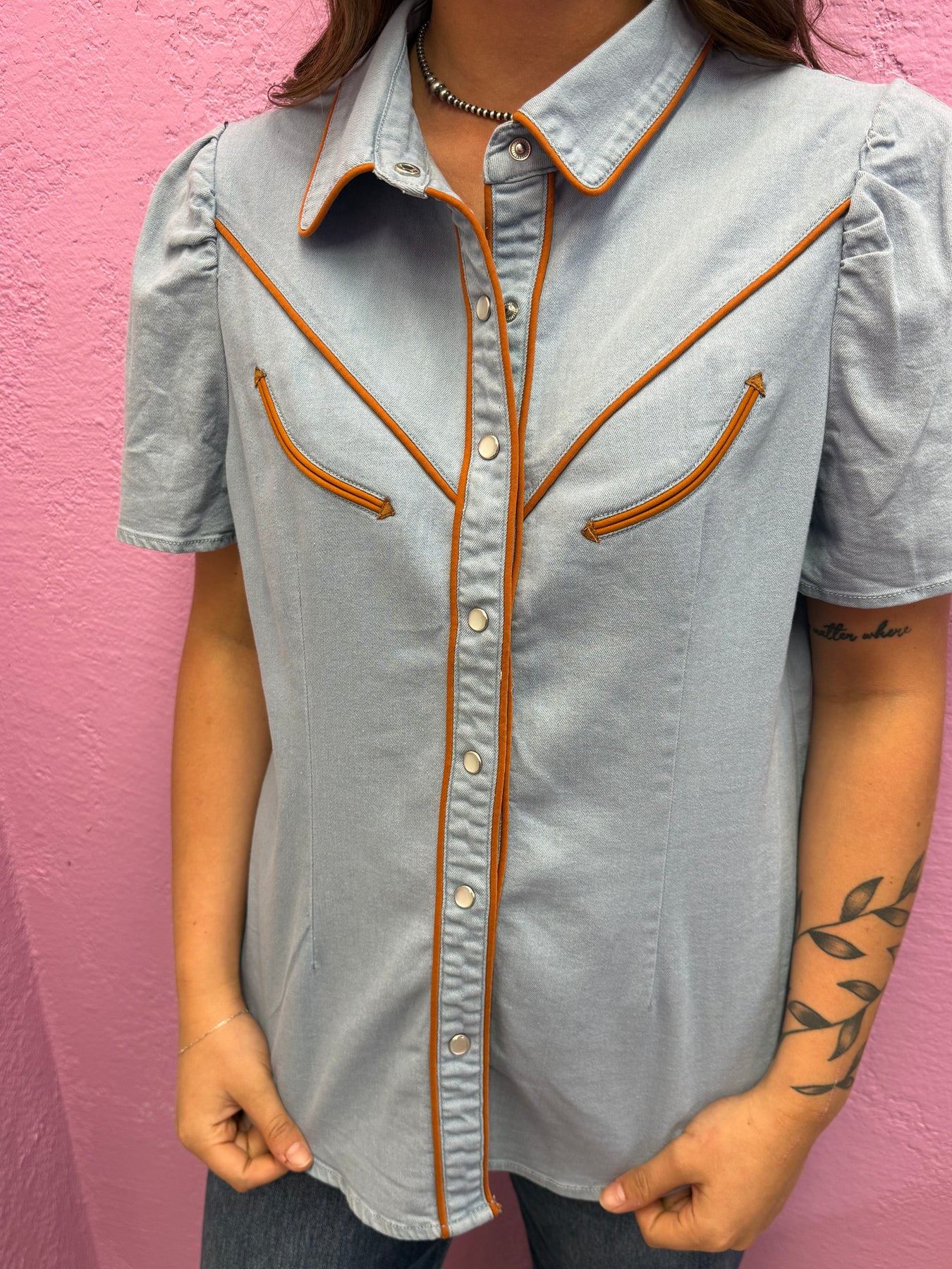 L&B Light Wash Camel Contrast Pearl Snap Puff Sleeve Top